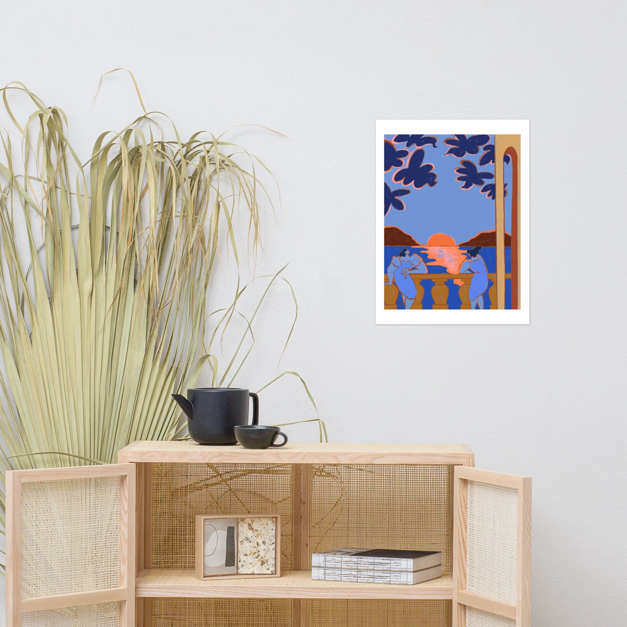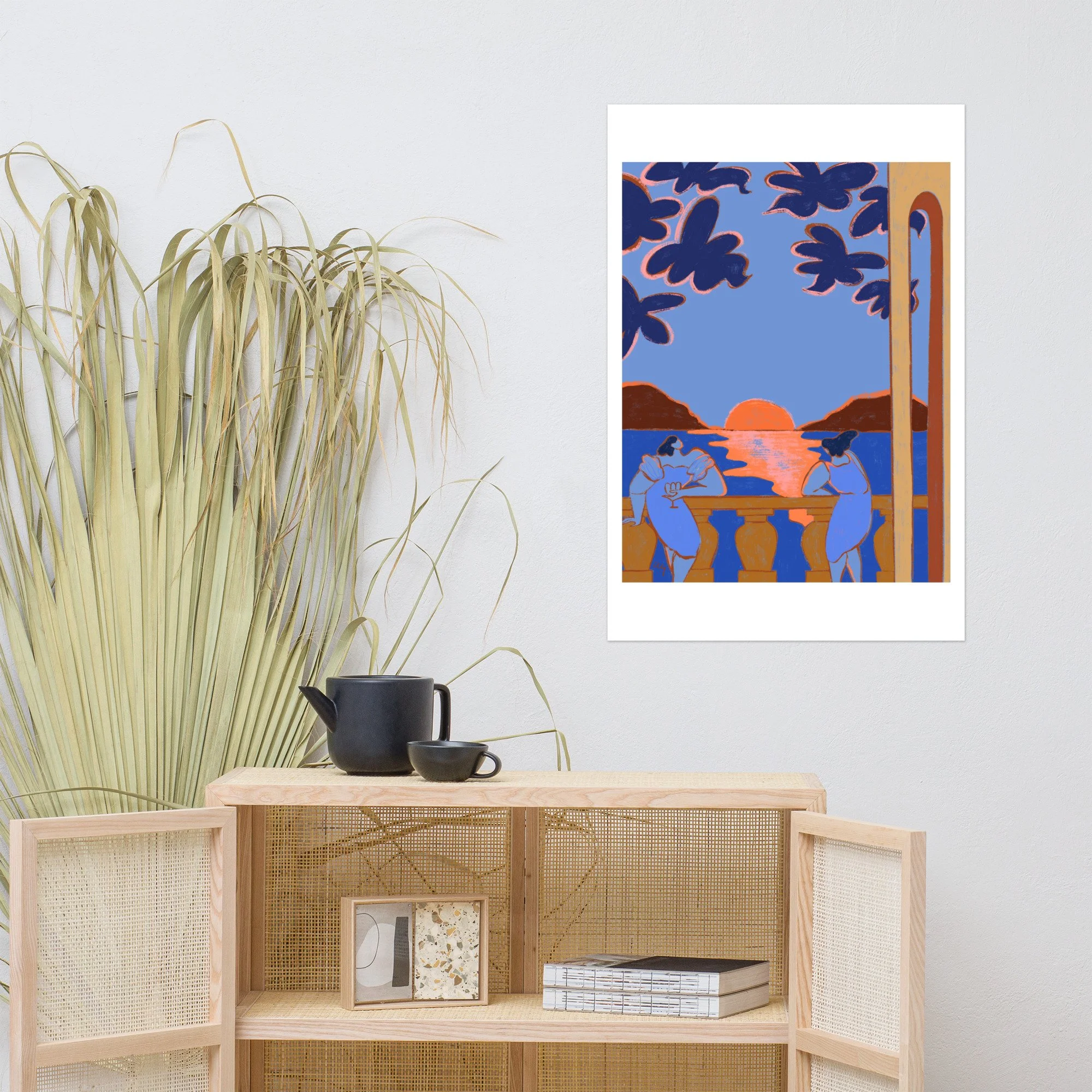 Immersed in deep conversation, two women stand upon a balcony. their words flowing like the tides. The ocean listens in stillness, twilight gathers at their shoulders, and the moment hangs—warm, fleeting, eternal.