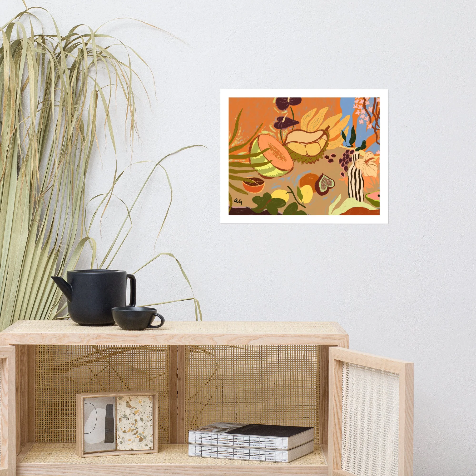A whimsical still life bursts with abundance—durian, melon, fig, banana, papaya, grapes, and bright anthuriums arranged in a playful harmony. The artwork captures the season’s lush spirit, celebrating the joy, vibrancy, and sweetness of summer’s gifts.